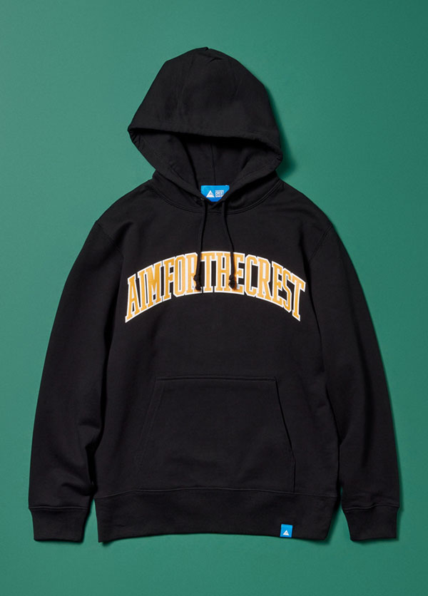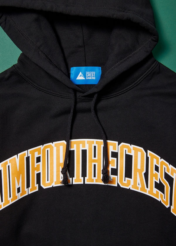 CREST GAMINGの理念を表すタグラインAIM FOR THE CRESTをフロントにプリントしたフーディ。